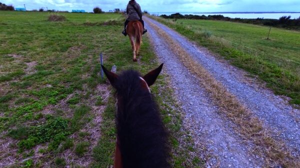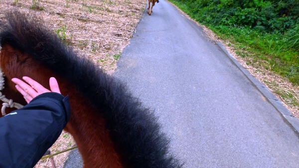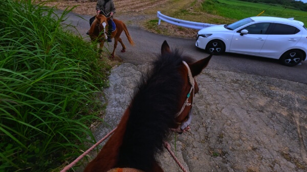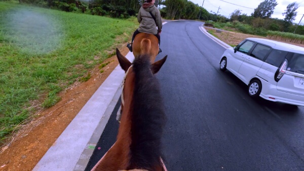 マンツ―というか、公道を歩くのでスタッフさん側は馬に乗って先導する人とバイクでさらにその先まで先導する人の二名体制。体験料22,500円と結構お高いんだけど、人件費考えたらそうなっちゃうよね、と納得。