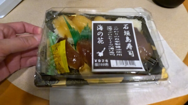 今日の晩ご飯。こちらはゆらてぃく市場で購入したいかとマグロの漬けの寿司。