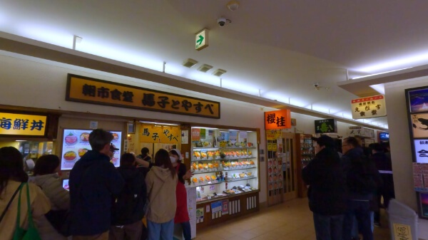 どんぶり横丁には6:30ぐらいから開いている店もあるのですが、お目当ての店が7時開店だったので朝市をぶらついて時間を潰す。この時間だと空いてる。
