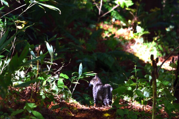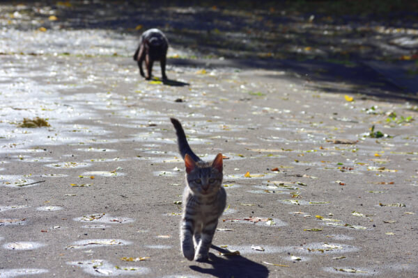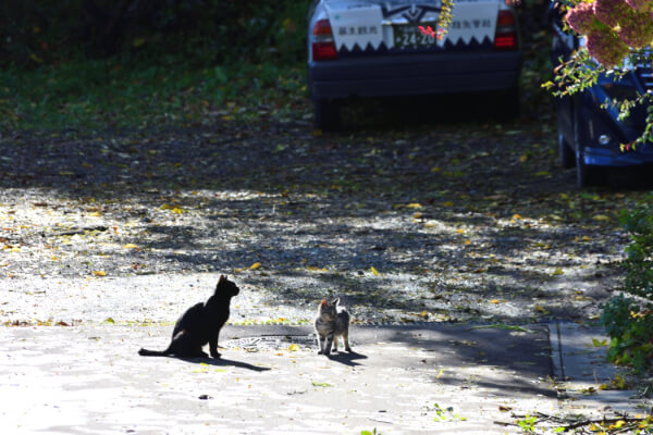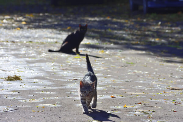 カメラ向けてるとちいさねこが興味津々にトテトテトテって寄ってきたんだけど、後ろでおおきねこがガン見してる。