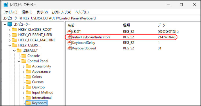 • 起動時ONにしたい → まず HKEY_USERS\.DEFAULT\Control Panel\KeyboardInitialKeyboardIndicators を「2」に変更してみる
