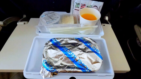 通路挟んで隣の人が特別食(多分ヒンドゥ食かハラル食)で、こんがりチキンの下にカレーピラフみたいなやつだったで絶対あっちの方が良かった。