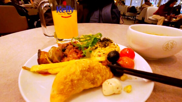 まあでもそんなに時間かからんだろうと読んで、若干待機列が短めだったSky Hub Loungeに並んでみる。読み通り15分ぐらいで入れてもらえた。入ってしまえばラウンジ内は混雑感はなくうまく調整されている。ただ電源のあるテーブルが取れなかったのが残念(後半空いたのですかさず移動)。正直ゆっくりするなら外のナップゾーンとかの方が空いてるんだけどやっぱり食べたいラウンジ飯。