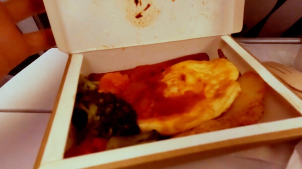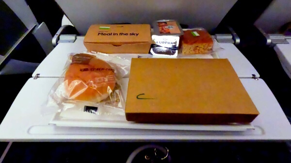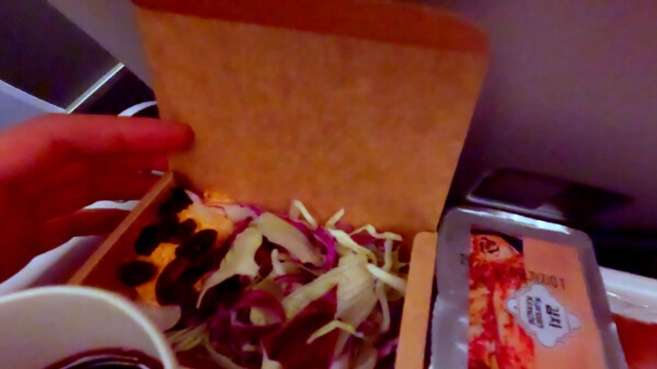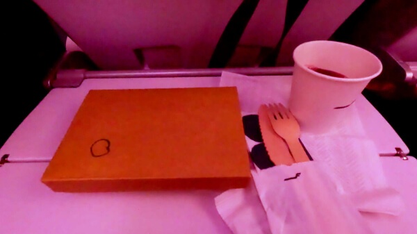 横の小さいパック、よく見てなくてデザート的な何かだろうと思って後回しにしてたらまさかのキムチだった。機内でキムチ!?とちょっとためらったけど残ってたご飯に混ぜて食べた。そこそこ辛かった。