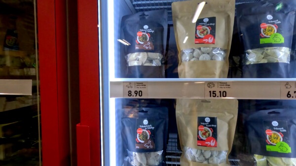 カウンターで注文&先払い。15分ぐらいかかるけどいい?って訊かれたけど急ぐ用もないのでOKしてテーブルへ。そしたらおもむろにスタッフさんがお持ち帰り用の冷凍のペリメニが入っている冷蔵庫を開けてペリメニの袋を取り出して鍋へ。