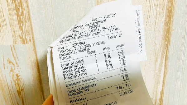 というのもスーパーに行くと、カレフのでっかい板チョコが会員価格で半額とかで売ってるわけですよ。けどスーパーの会員カードってやつはエストニアの市民カードみたいなのを持ってないと作れない(っぽい)。かといって「会員半額」を見たあとにわざわざ定価で買うのって馬鹿らしい気がして「買わないぞ」ってなってたんだけど、ここのお店でいくつか割引価格になってるやつがあったのでそればっかを選んで買ってきました。